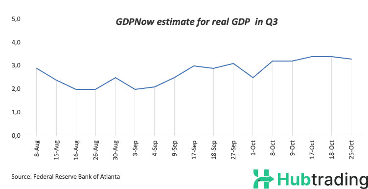 The latest GDPNow forecast from the Federal Reserve Bank of Atlanta, released on Friday, predicts that the US economy expanded at an annual rate of 3.3% in Q3.