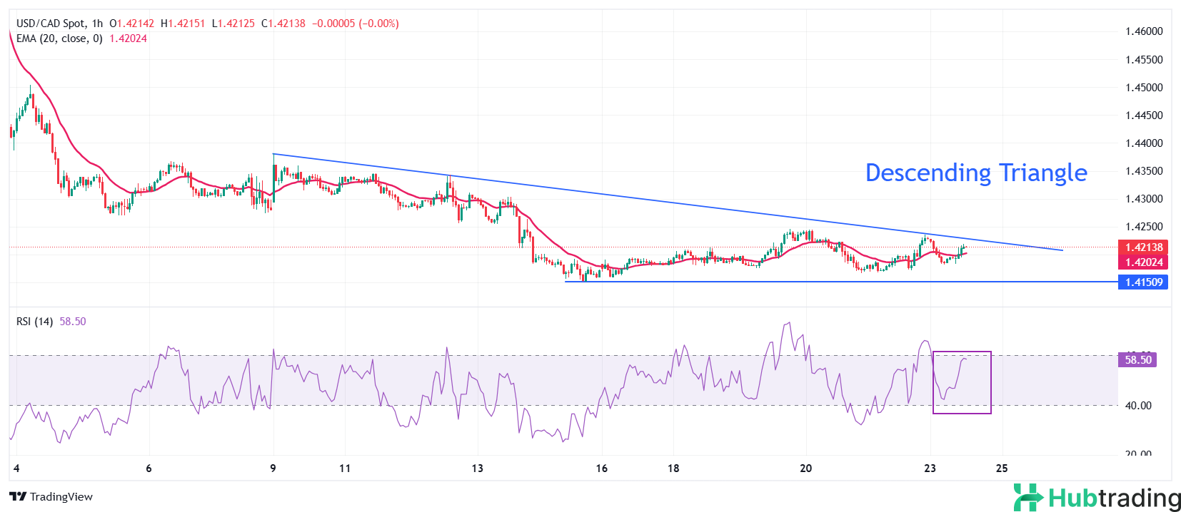 The USD/CAD is currently forming a Descending Triangle pattern on the hourly chart. The upper downward-sloping trendline is drawn from the February 9 high of 1.4380, while the flat lower trendline is placed from the February 14 low of 1.4151.