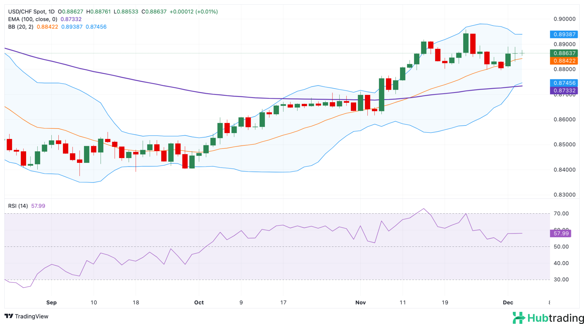 The USD/CHF pair remains steady around 0.8860 during the early European session on Wednesday, with traders awaiting key US events this week. Market attention is focused on US Federal Reserve Chair Jerome Powell’s speech later today, followed by Friday's release of the US November employment data, including Nonfarm Payrolls (NFP), Unemployment Rate, and Average Hourly Earnings.