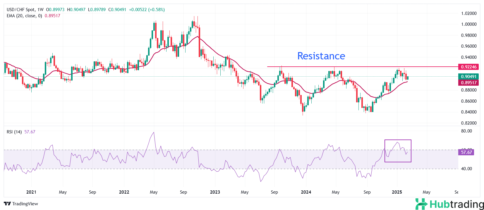 Technically, USD/CHF aims to revisit its 15-month high near 0.9200. The pair remains in an uptrend, with the 20-week Exponential Moving Average (EMA) around 0.8950 trending higher. However, the 14-week Relative Strength Index (RSI) has retreated from bullish levels, indicating fading momentum.