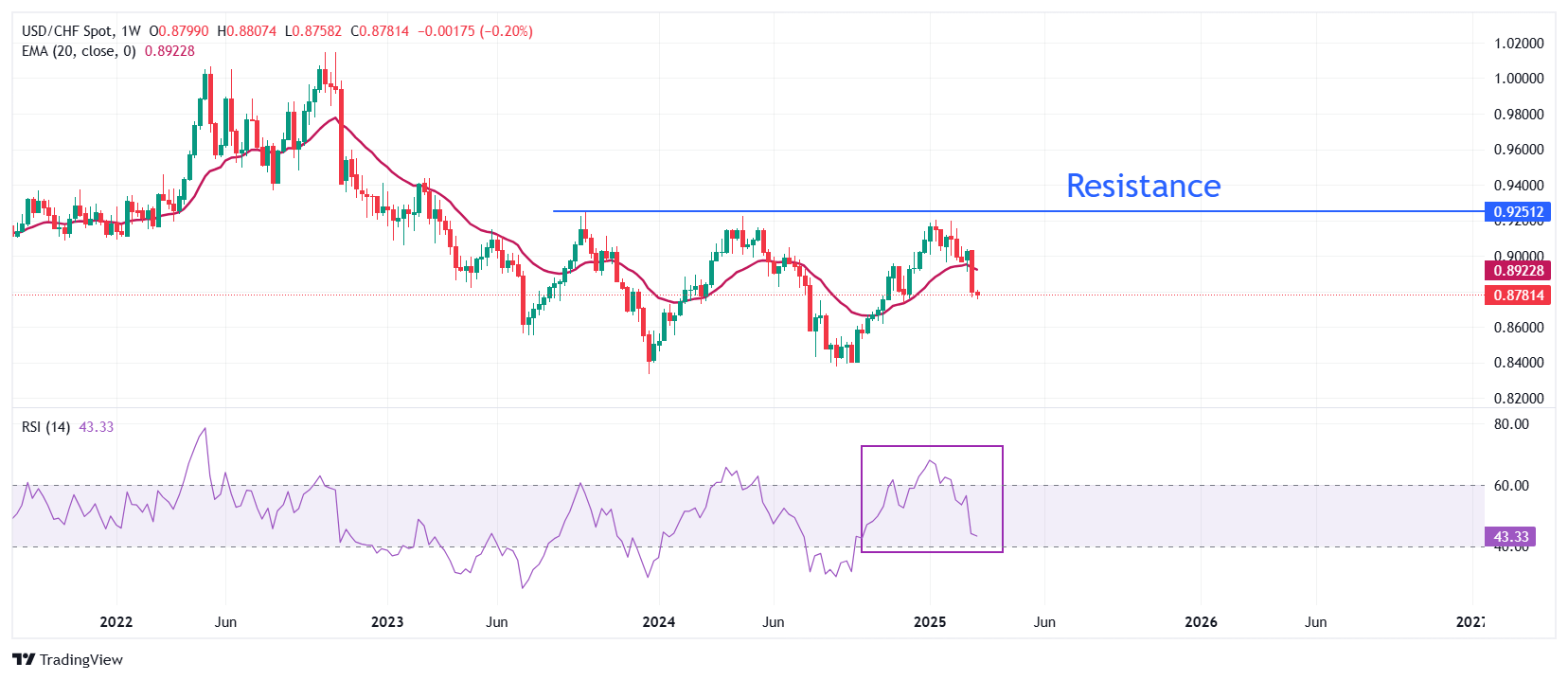 USD/CHF has dropped sharply after failing to retest its 15-month high of 0.9245. The pair’s outlook remains uncertain as it trades below the 20-week Exponential Moving Average (EMA) near 0.8920. The 14-week Relative Strength Index (RSI) has declined toward 40.00, with a potential bearish signal if it moves lower.