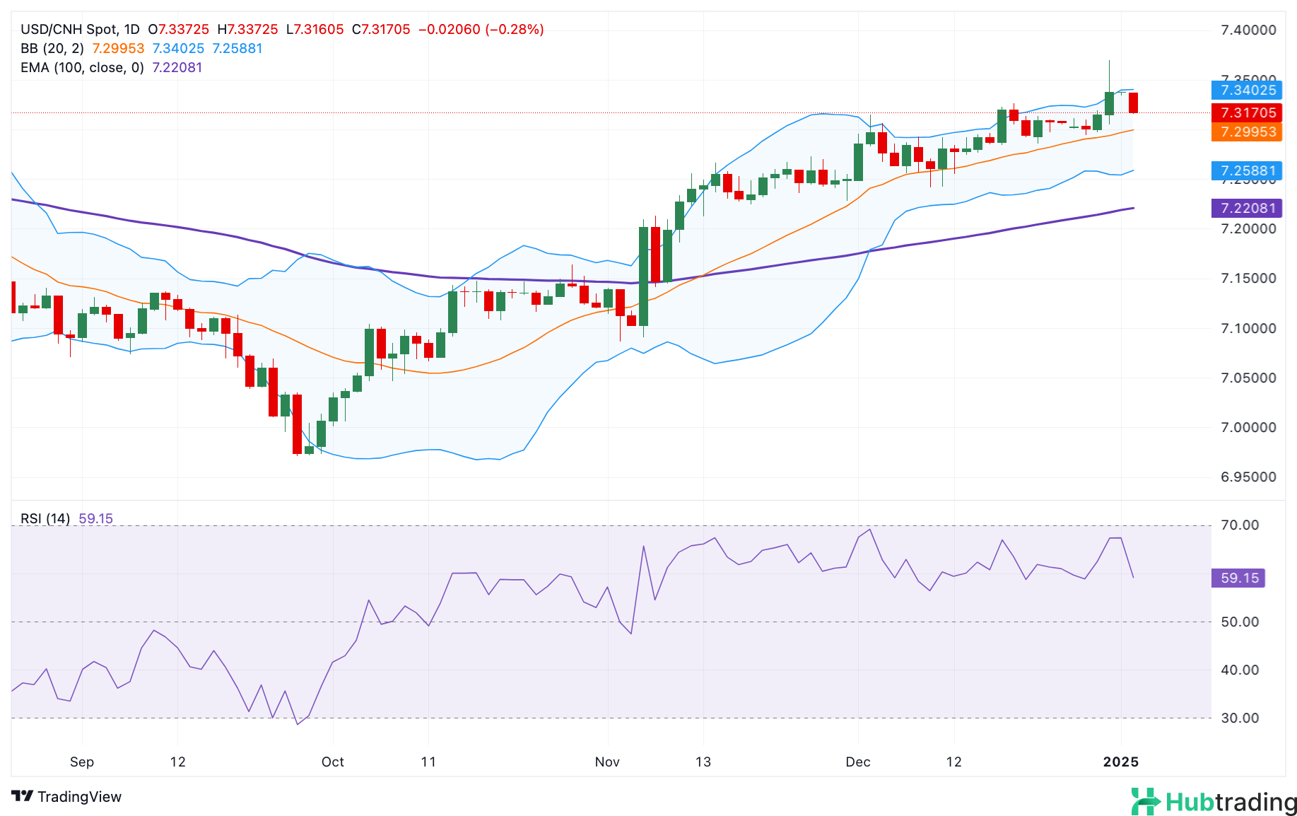 Immediate resistance is at the 7.3400-7.3405 region, marked by the upper Bollinger Band and a psychological level. A break above this zone could open the door to 7.3697, the December 31 high.