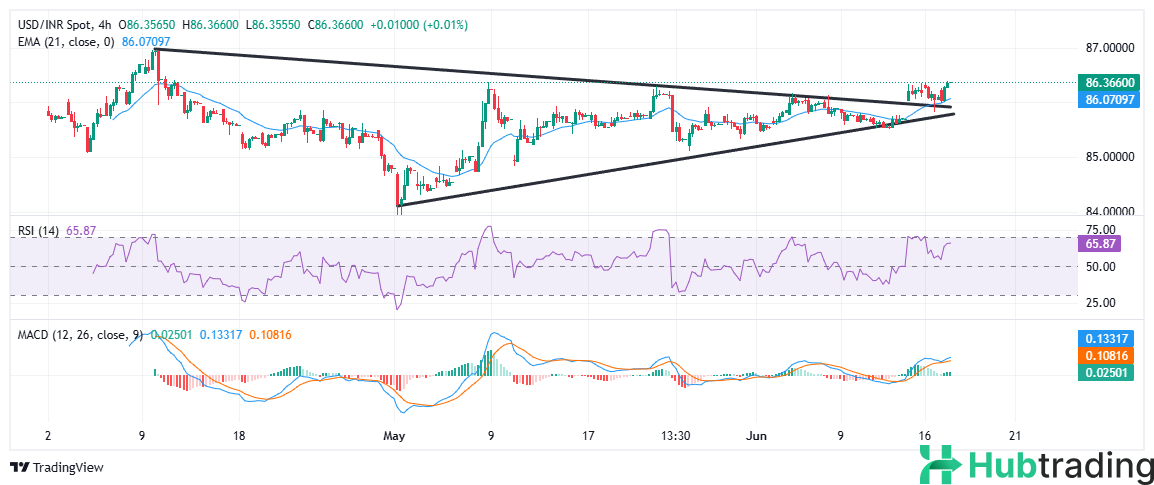 The USD/INR pair recently broke above a multi-week symmetrical triangle on the 4-hour chart, signaling a possible shift in short-term trend. However, the bullish breakout has lost traction near the 86.50 mark, with the pair now trading around 86.07, just above the 21-period Exponential Moving Average (EMA) at 85.97.