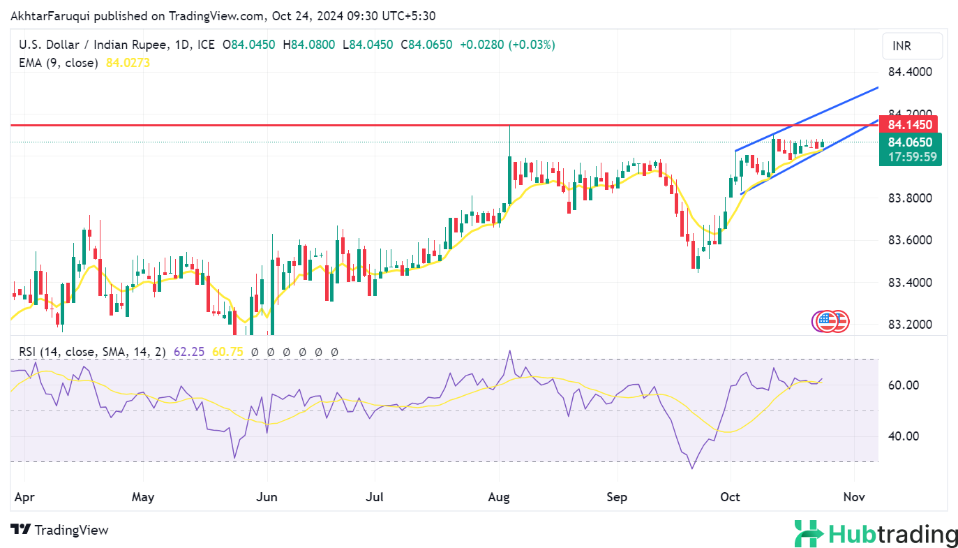 The USD/INR pair remained stable above 84.00 on Thursday, with the daily chart showing that the pair is trading within an ascending channel, indicating a bullish bias. The 14-day Relative Strength Index (RSI) is nearing 70, further reinforcing this upward momentum.