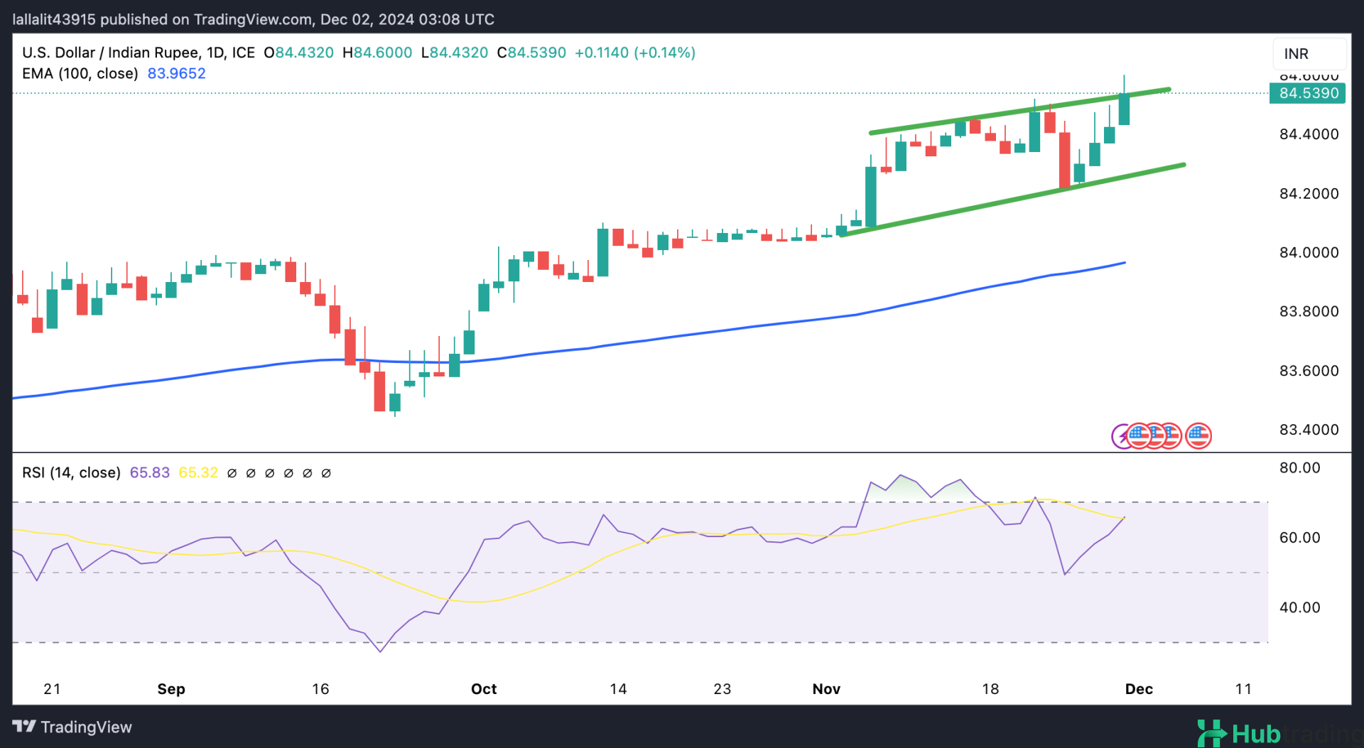 A break above the ascending trend channel at 84.55 could push USD/INR toward the key psychological level of 85.00.