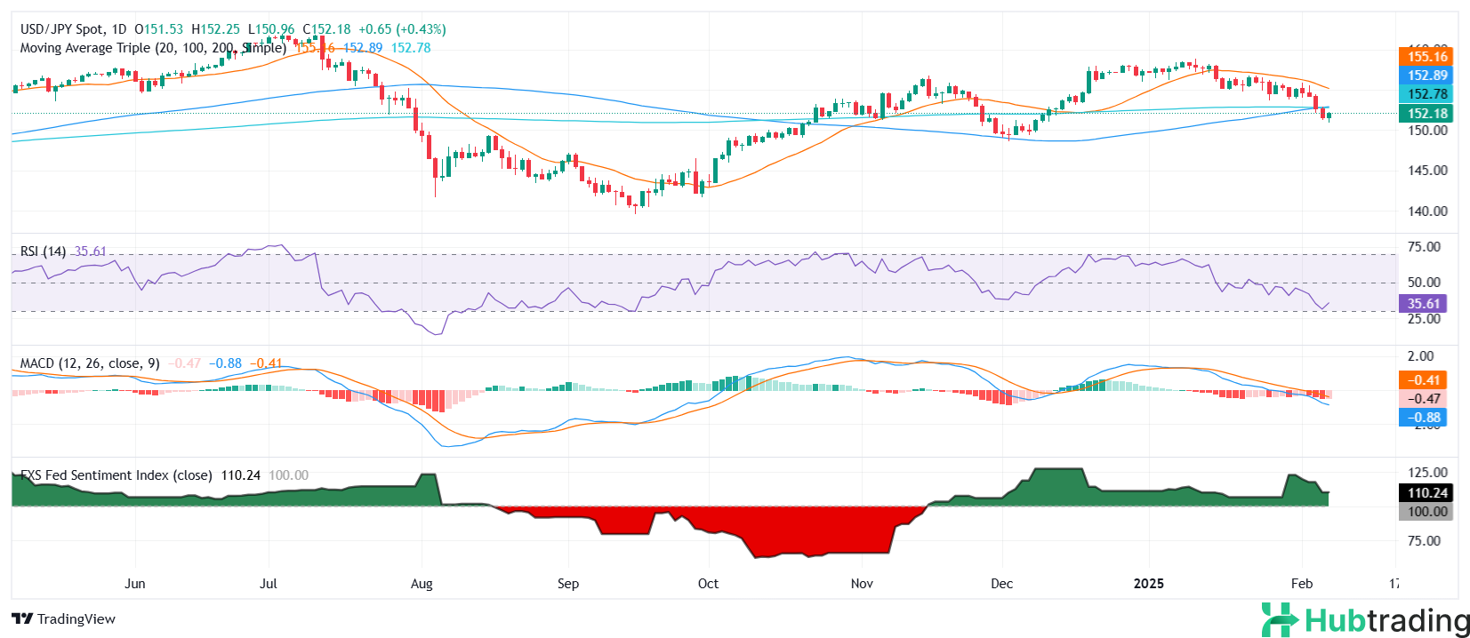 USD/JPY rose 0.48% to 152.10 on Friday, driven by the US Dollar's strength amid cautious remarks from Federal Reserve officials. Traders are closely watching the upcoming Nonfarm Payrolls (NFP) report, expected to show a 175K job gain for January. A whisper estimate suggests a slightly higher reading of 199K, pointing to continued labor market resilience.