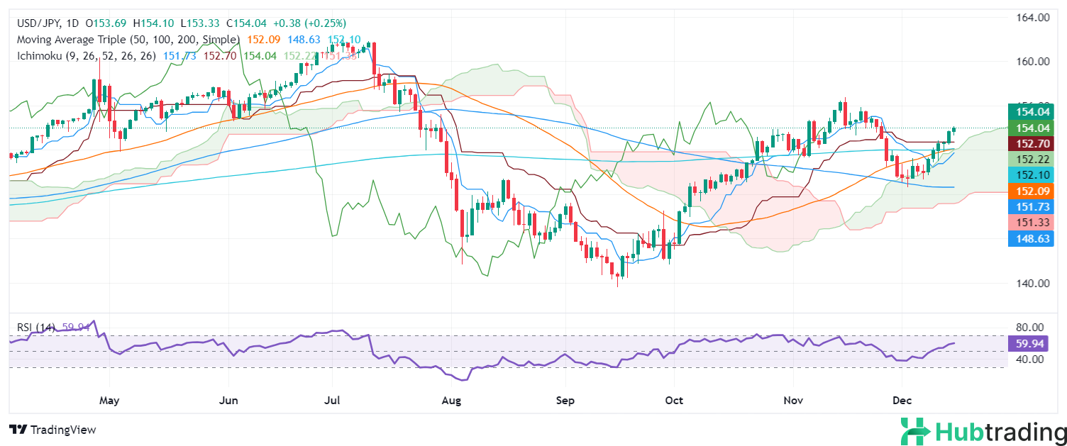 USD/JPY has extended its rally, breaking above the 200-day Simple Moving Average (SMA) and the Kijun-Sen, clearing key levels like 153.00 and the critical 154.00 mark.