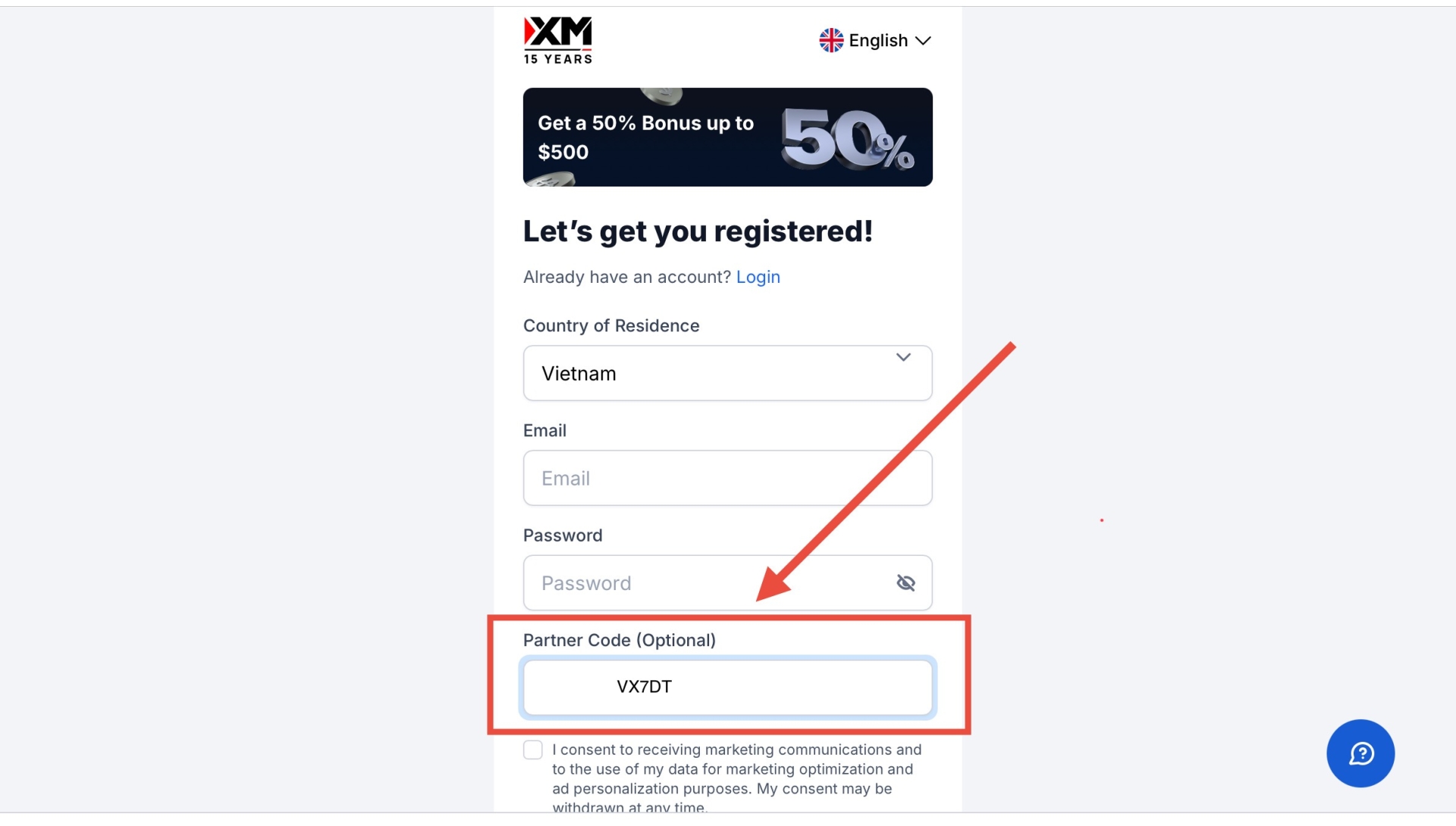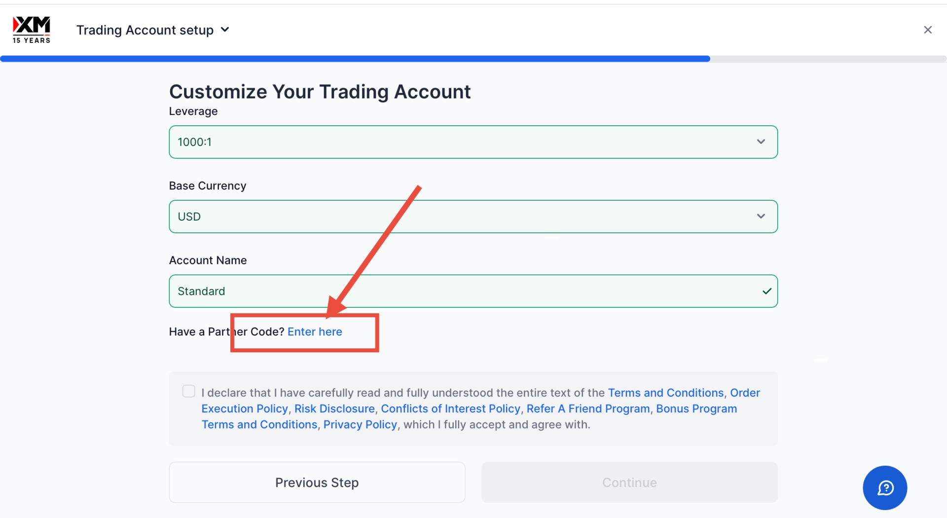 • Method 1: Open a new XM account and enter Hubtrading’s partner code during registration. This applies to those who do not have an XM account yet.