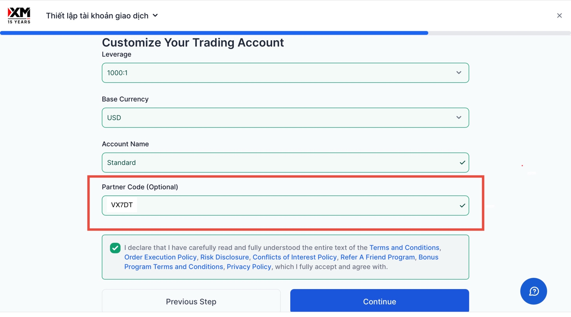 If you want to open additional trading account IDs, just follow the same steps and remember to enter the IB code: VX7DT in the Partner Code field during account setup to receive automatic daily trading fee rebates.